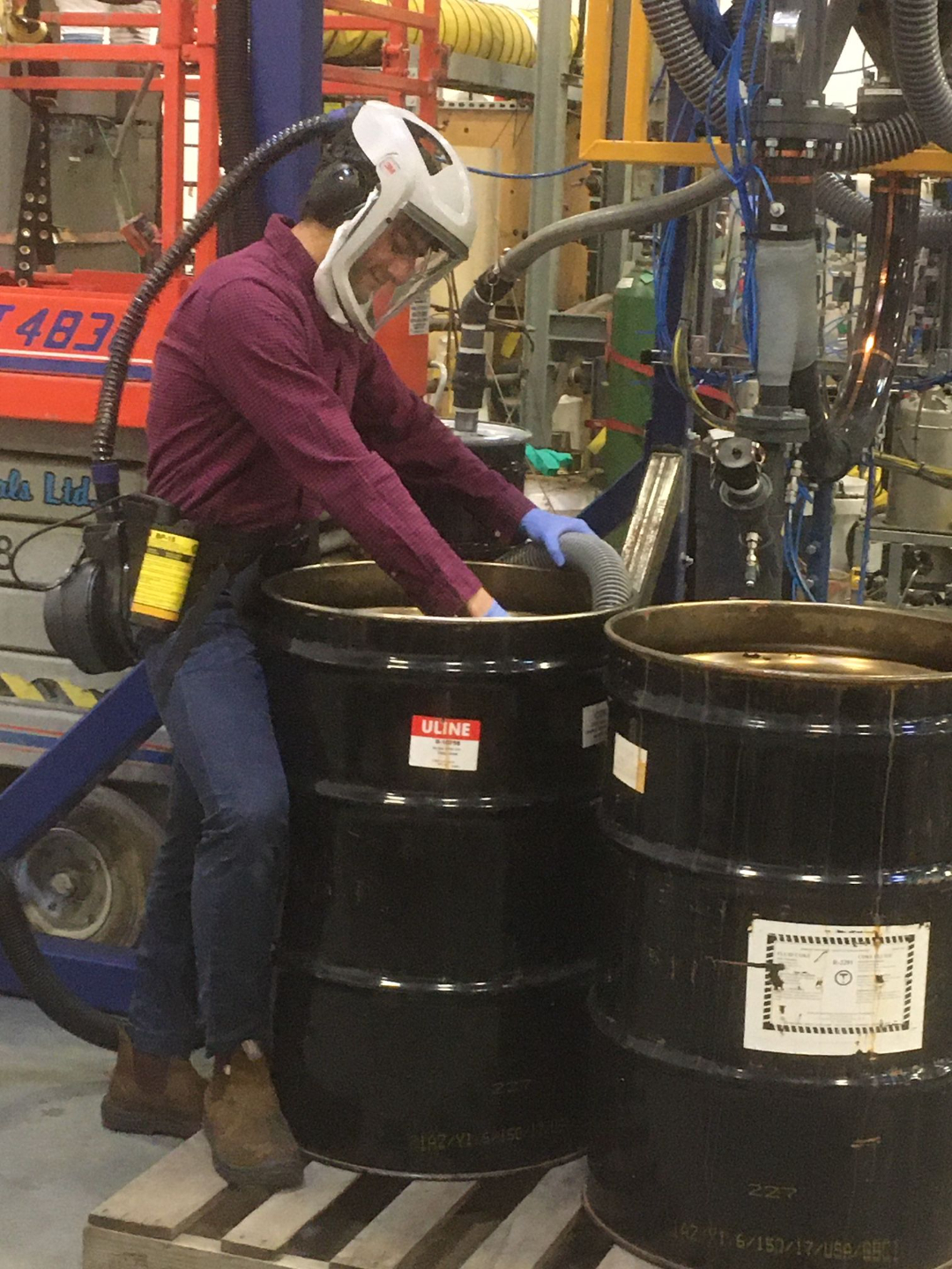 Wearing a positive pressure supplied air respirator while loading a fluidizied bed with solids